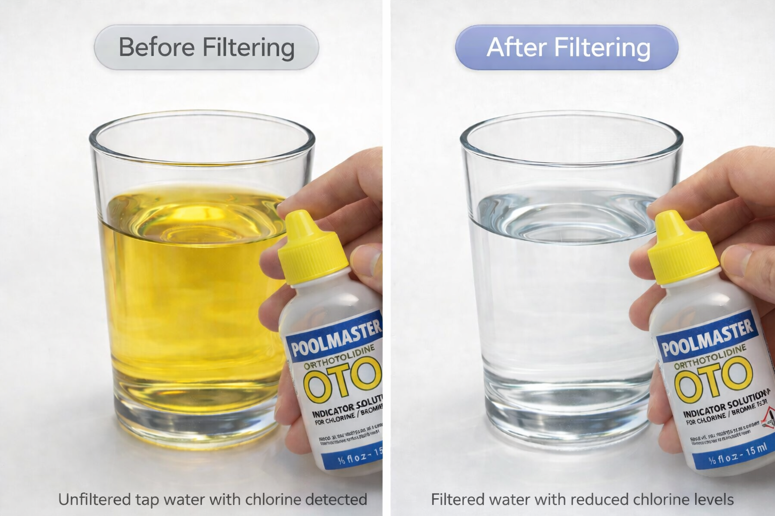 Here is the result after testing normal tap water and filtered water using a chlorine indicator. The yellow color shows the presence of chlorine in untreated tap water, while the clear result after filtration shows how effectively the filter reduces it.
